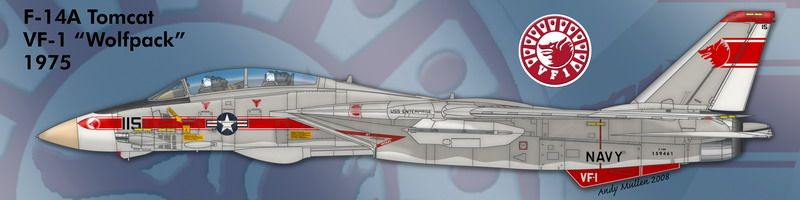 A 1978 Hasegawa first edition of the F-14A, in the high-visibilty markings of VF-1 Wolfpack as shown here in profile by a true genius of F-14 builds, Mr. Andy Mullen. I bought the kit from a fellow IPMS Dublin branch member, Murfv (thanks Vincent) and I can't wait to get started.